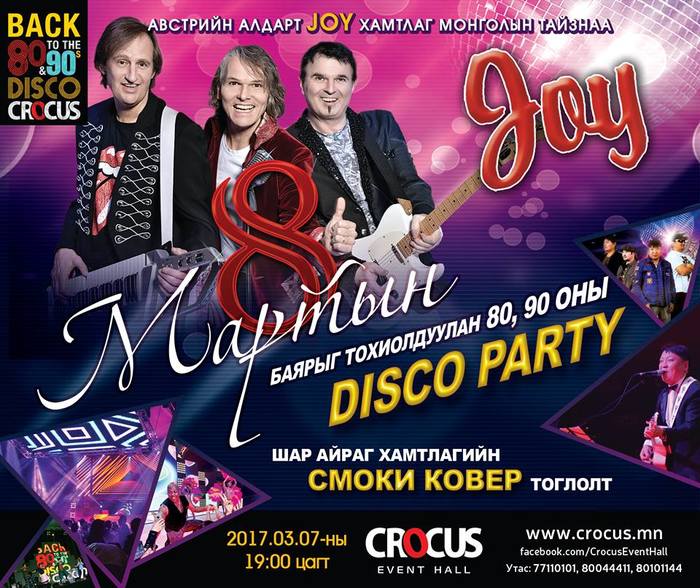 Нүд баясаж чих дэлдийлгэх Март 8-ны гайхамшигт үдэш айсуй. Крокусийн урилгаар Монголд анх удаа тоглох Joy хамтлагийн тоглолт эхлэхэд цөөхөн хоног үлдсэн байна шүү. Эмэгтэйчүүдийн баярыг тохиолдуулан нийслэл хотод олон үзвэр, үйлчилгээ байгаагийн нэг нь 80, 90-ээд оны диско хөтөлбөрийн үргэлжлэл, Европын алдарт Joy хамтлагтай хамт “Шар айраг” хамтлагийн “Smokie” ковер тоглолт болох нь. Тиймээс та баярын өдрөө хэрхэн тэмдэглэхээ шийдээгүй байгаа бол “нэг сумаар хоёр туулай буудах” Крокусийн үдшийг сонгоорой гэж зөвлөе.