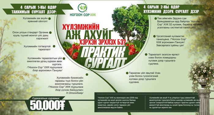 Энэхүү сургалтыг олон жилийн туршлагатай “Ногоон Сор” ХХК өөрийн хүлэмж дээрээ зохион байгуулах бөгөөд бүртгэлтэй холбоотой болон илүү дэлгэрэнгүйг 80992200,94094009 дугаараас лавлана уу.