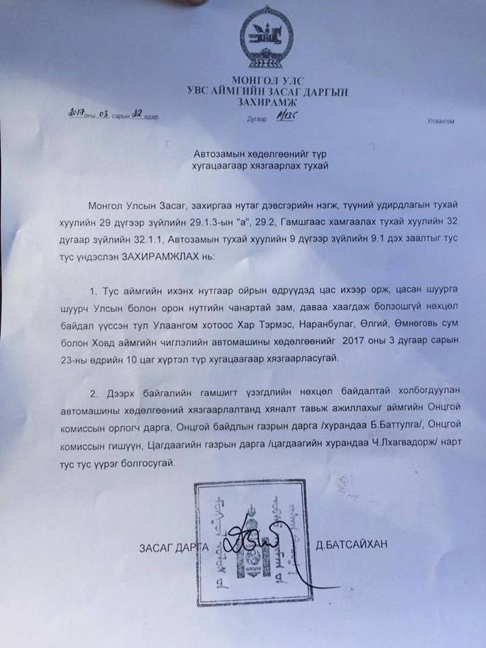 Улаангом хотоос Хар Тэрмэс, Наранбулаг, Өлгийн, Өмнөговь сум болон Ховд аймгийн чиглэлийн автомашины хөдөлгөөнийг 2017 оны 3 дугаар сарын 23-ны өдрийн 10 цаг хүртэл түр хугацаагаар хязгаарласан байна.