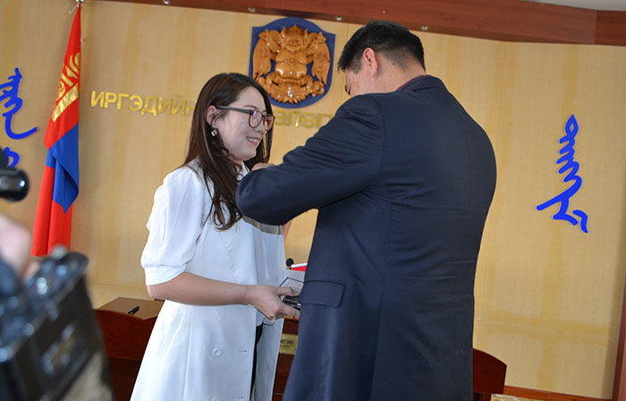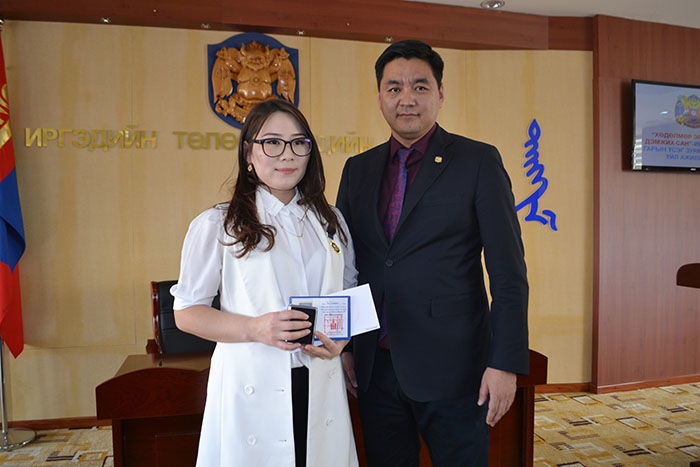 Яаралтай тусламжийг цаг алдалгүй үзүүлж эх, хүүхдийг эсэн мэнд аварсан гавьяаг нь үнэлж Б.Солонгыг ХУД-ийн Засаг дарга Ж.Алдаржавхлан дүүргийн “Хүндэт тэмдэг”-ээр шагнаж урамшууллаа. Цаашид сайн үйлс бүхнийг дүүргийн Засаг даргын зүгээс дэмжин ажиллах болно гэдгээ илэийлсэн юм.