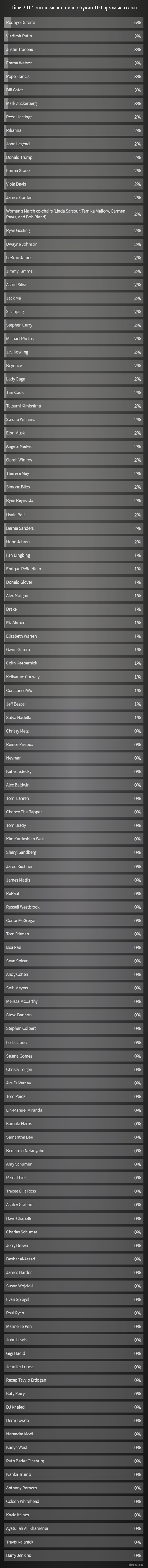 Уг санал асуулгыг одоогийн байдлаар Филлипиний ерөнхийлөгч Родриго Дутертэ тэргүүлж байгаа бол Оросын ерөнхийлөгч Владимар Путин, Канадын ерөнхий сайд Жастин Трюдо, Жүжигчин Эмма Уатсон нар удаалж байна.