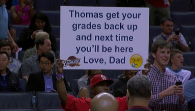 Өнгөрсөн баасан гаригт болсон үндэсний сагсан бөмбөгийн холбооны Cleveland Cavaliers болон Charlotte Hornets багуудын тоглолтын үеэр нэгэн хөгжөөн дэмжигч муу сурдаг хүүдээ хандан "Томас, хичээлийнхээ дүнг сайжруулбал дараагийн удаа чи энд хамт байх болно. Хайрт, аав" гэсэн самбар барьж зогссон байсан нь зураглаачдын дуранд өртжээ.