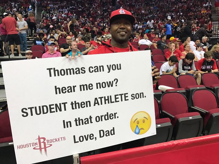 Тролл аав маань ингээд зогссонгүй, ням гаригт болсон Houston Rockets болон Oklahoma City Thunder багуудын үеэр мөн "Томас, одоо намайг сонсож байна уу? Эхлээд оюутан дараа нь тамирчин гэсэн дарааллаар шүү, хүү минь. Хайрт, аав" гэсэн самбар барьж зогсож байжээ.