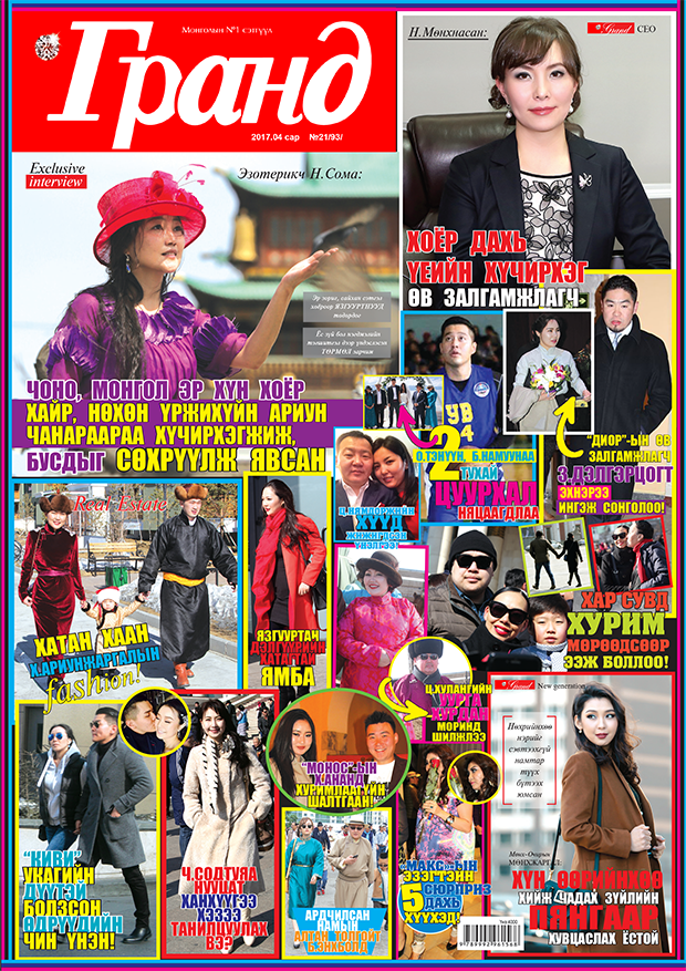Налгар хаврын найртай өдрүүд үргэлжилж байна. Сэтгэл сэргэм өөрийгөө чагнаархан удаан суумаар гэгэлгэн өдрүүдэд бид та бүхэнд нэгэн шинэ дугаараа дэлгэж байна. Энэ дугаарын онцгой зочин Эзотерикч Н.Сома байв. Хэвлэлд ам нээдэггүй ихэд нууцлаг оршдог оюунлаг бүсгүйтэй тун няхуур яриа дэлгэсэн. БИ-гээ танин мэдэх хүсэлтэй хэн бүхэнд зориуллаа. Юу гээч, бидний өвөг дээдэс нөхөн үржихүйн маш өндөр ёс суртахуунтай, нэг хавьтагчдаа насаараа үнэнч байсан учир амжилтанд хүрч цаашлаад дэлхийг байлдан дагуулжээ. Туйлын задгай болсон бурангуй нийгэмд энэ бүсгүйн тоймтой хэдхэн үг хүчтэй харанга дэлдэж орхилоо. Яагаад нөхөн үржихүйн хувьд өндөр ёс суртахуунтай чоно мэт үнэнч байх ёстой талаар та бүхэн “Гранд” сэтгүүлийн №93-аас дэлгэрүүлэн уншаарай.
