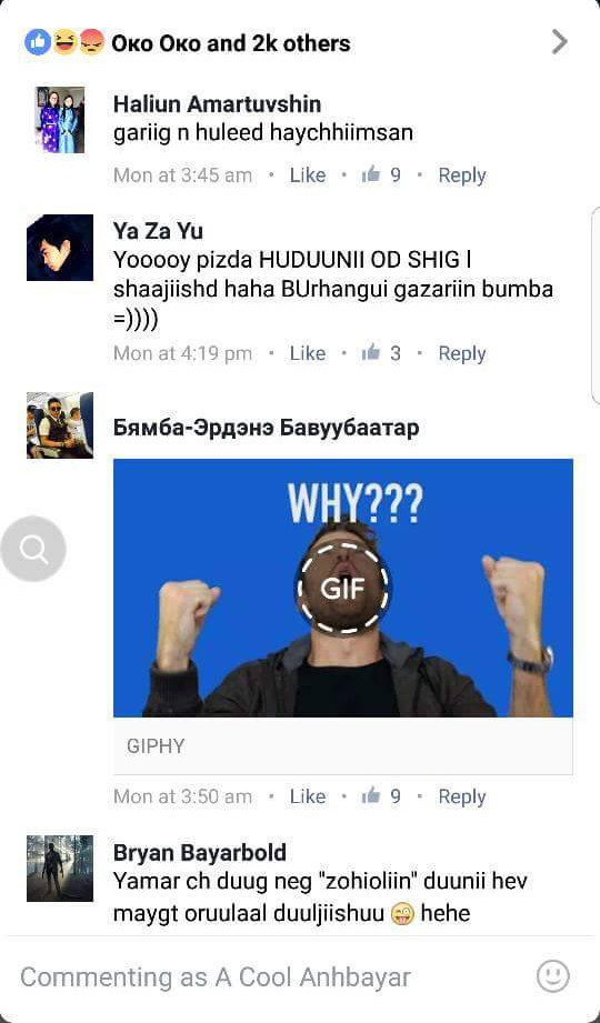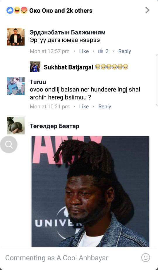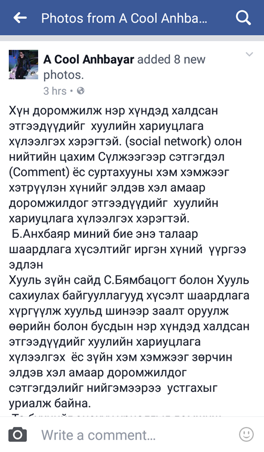 "Хүн доромжилж нэр хүндэд халдсан этгээдүүдийг хуулийн хариуцлага хүлээлгэх хэрэгтэй. (social network) олон нийтийн цахим Сүлжээгээр сэтгэгдэл (Comment) ёс суртахууны хэм хэмжээг хэтрүүлэн хүнийг элдэв хэл амаар доромжилдог этгээдүүдийг хуулийн хариуцлага хүлээлгэх хэрэгтэй. Б.Анхбаяр миний бие энэ талаар шаардлага хүсэлтийг иргэн хүний үүргээ эдлэн Хууль зүйн сайд С.Бямбацогт болон Хууль сахиулах байгууллагууд хүсэлт шаардлага хүргүүлж хуульд шинээр заалт оруулж өөрийн болон бусдын нэр хүндэд халдсан этгээдүүдийг хуулийн хариуцлага хүлээлгэх ёс зүйн хэм хэмжээг зөрчин элдэв хэл амаар доромжилдог сэтгэгдэлийг нийгэмээрээ устгахыг уриалж байна. Та бүхнийг энэхүү уриалгыг дэмжиж хамтдаа тасална зогсооно гэдэгт итгэж байна МУ-н иргэн Б.Анхбаяр Дуучин МУСТА ( A Cool)"