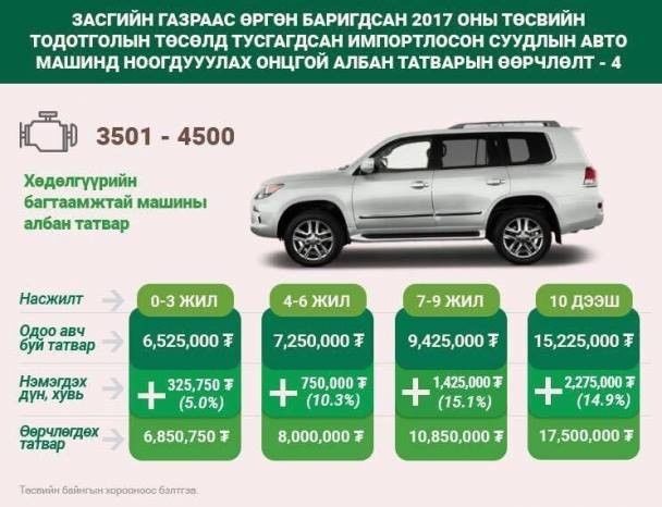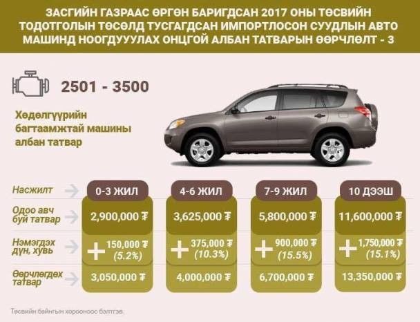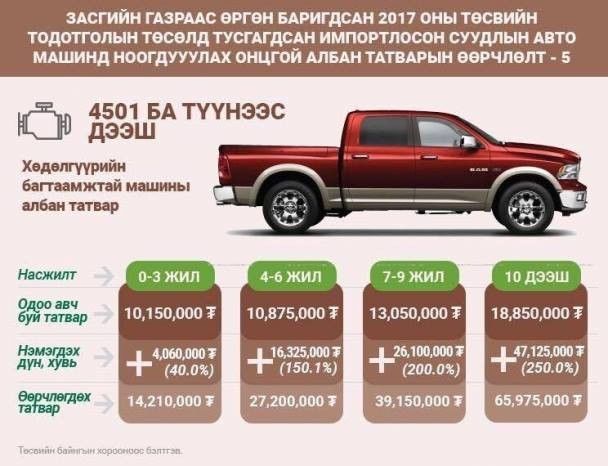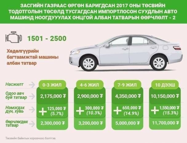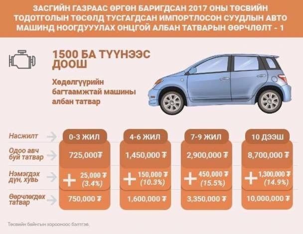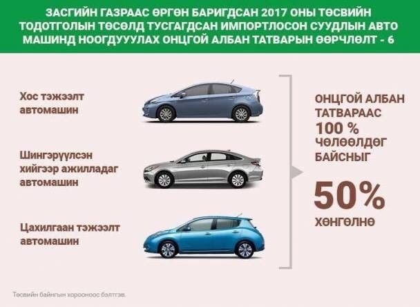 Мөн хос тэжээлт, цахилгаан хөдөлгүүрт болон хийгээр ажилладаг автомашины онцгой албан татварыг 50 хувиар хөнгөлөхөөр хуулийн төсөлд тусгасан хэмээн Сангийн яам чуулганы хуралдаанаар мэдээлсэн. Тэгвэл Төсвийн байнгын хорооноос суудлын автомашинд ноогдуулах онцгой албан татварын инфографикийг гаргажээ.