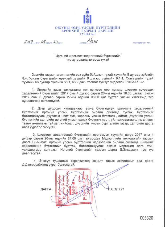 Монгол Улсын Ерөнхийлөгчийн сонгууль ирэх зургаадугаар сарын 26-ны өдөр болно. Үүнтэй холбогдуулан хуульд заасны дагуу шилжилт хөдөлгөөнийг зогсооно.