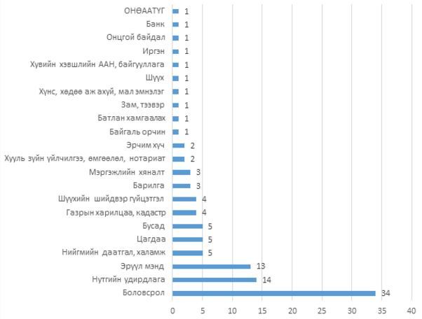 Гомдол, мэдээллийн агуулгын хувьд 26.4 хувь нь ашиг сонирхлын зөрчил, хөрөнгө орлогын мэдүүлэгтэй холбоотой, 3.6 хувь нь гэмт хэргийн шинжтэй, 7.3 хувь нь харьяалалд хамаарахгүй, 56.4 төрийн байгууллагын ёс зүй, хүнд суртал, удирдах ажилтны гаргасан шийдвэртэй холбоотой гомдол, мэдээлэл зонхилж байна. Гомдол мэдээллийг салбар, байгууллагаар нь авч үзвэл боловсрол, нутгийн удирдлага, эрүүл мэндийн байгууллагатай холбоотой гомдол, мэдээллийг харьцангуй олон ирүүлжээ. Тухайлбал Нийслэлийн 12-р сургууль, 14-р сургууль, 52-р сургууль, 6-р сургууль, 71-р сургууль, 56-р цэцэрлэг, 80-р цэцэрлэг зэрэг боловсролын байгууллагууд хууль бус төлбөр, хандив авч буй талаар ирүүлсэн бол Шастины нэрэмжит 3-р эмнэлэг, Сүхбаатар дүүргийн 8-р хороо, Баянзүрх дүүргийн 19-р хорооны өрхийн эмнэлэгийн албан хаагчдын ёс зүйтэй холбоотой гомдол мэдээллүүд цөөнгүй иржээ. Иймд иргэд, олон нийт, эцэг эх, оюутан сурагчид хууль бус үйлдлийн талаар болон төрийн албан тушаалтан албаны эрх мэдэл буюу албан тушаалын байдлаа урвуулах, төрийн байгууллагын хүнд сурталын талаар санал, гомдол, мэдээллийг АТГ-ын 1800-1969 дугаарын утсанд өгч, цаашид энэ төрлийн хууль бус үйлдэл дахин гаргахаас сэрэмжлэхийг зөвлөж байна.