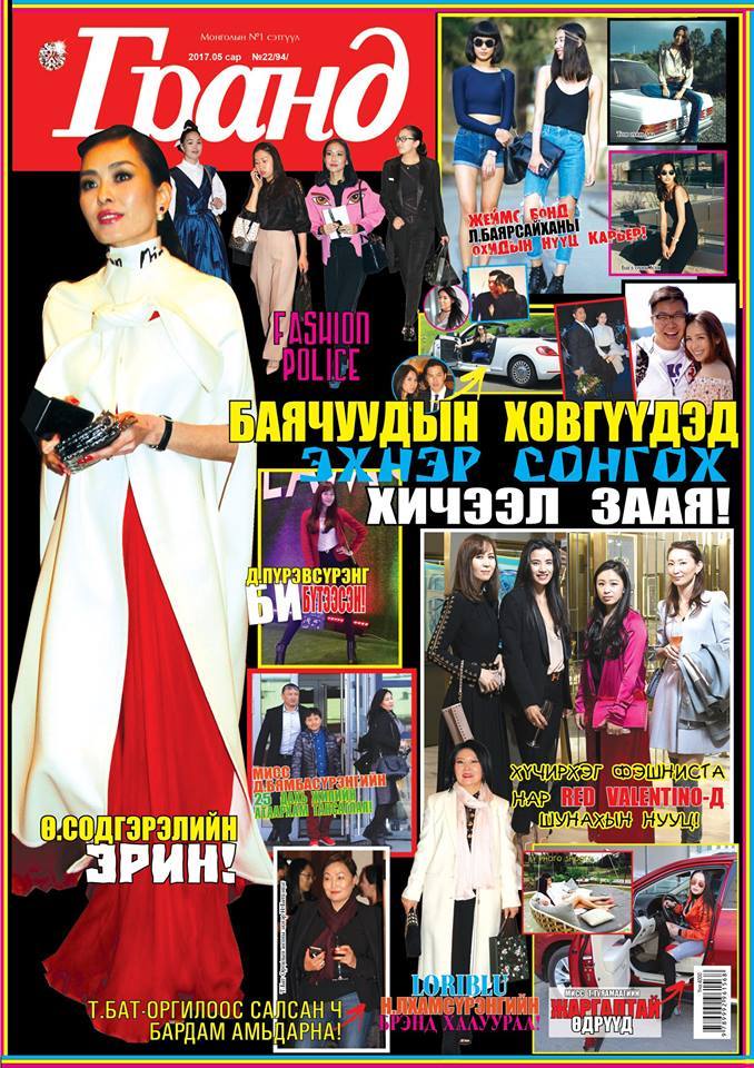 Долоо дахь жилдээ уншигчдын гар дээр очиж буй “Гранд” сэтгүүлийн цоо шинэхэн дугаар худалдаанд гарлаа. Сүүлийн үед дуулиан шуугианы эзэн болоод буй залуу дуучин Э.Чулуунчимэг ярилцлага өгсөн бол гол материалаар “Баячуудын хөвгүүдэд эхнэр сонгох хичээл заая!”, Ерөнхийлөгчид нэрээ дэвшүүлэхээр зэхэж буй улс төрчдийн эхнэрүүдийг сонжсон нийтлэл хоёрыг онцолсон байна. “Диор бутик”-ын өв залгамжлагч З.Дэлгэрцогт, Ж.Энхбаяр гишүүний хүү, сүүлийн үед “Киви” Укагийн дүү Д.Уранзаяатай нэр холбогдох болсон Э.Мөнхсүлд ,”Premier tailor”-ын эзэн Т.Зориг, “Монос”-ын өв залгамжлагч, “Монос” группийн гүйцэтгэх захирал Х.Ананд, АПУ-гийн П.Батсайханы хүү Б.Гантиг зэрэг шинэ үеийн хөрөнгөтнүүдийн хөвгүүд ирээдүйн эхнэрээ хэрхэн шилж сонгож байгааг, түүнд нь нийгэм олон нийт ямар баяр суурьтайг байгааг мэдээлсэн нь таныг сонирхлыг эрхгүй татах байхаа. Ханиа сонгоно гэдэг жирийн хүмүүсийн тухайд төдийгүй өв залгамжлагчдын хувьд том сорилт, чухал сонголт болохыг энд онцолсон байгаа юм. Цаашилбал, хоёр том нам болон МАХН-аас ирэх ерөнхийлөгчийн сонгуульд өрсөлдөхөөр зэхэж буй улс төрчдийн эхнэрүүдийн тухай мэдээлэл, энэ цагийн хүүхнүүд гал улаан тахиа жилд ямар брэндийн, ямар загвартай хувцсанд хошуурч байгаа тухай сонирхолтой мэдээлэл, “Гранд”-ын тогтмол булангуудын нэг “Fashion police”, “Гранд сонгодог” уран зургийн булан, “Та битгий уурлаарай” зэрэг уншигчдын шимтэн уншдаг булангууд сонирхолтой фото зураг, мэдээ материалаар дүүрэн гарчээ. Та “Гранд”-ыг сонгон уншиж, нийгэм цаг үетэйгээ хөл нийлүүлэн залуу, эрч хүчтэй алхаарай!