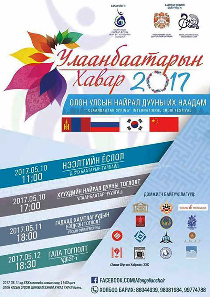 Дашрамд дуулгахад, Монголын соёл урлагийн хөгжилд хувь нэмрээ оруулсаар ирсэн "Монголын найрал дууны уран бүтээлчдийн холбоо" нь 2005 оноос найрал дууны их наадмыг "Хаврын баяр" нэртэйгээр 9 удаа амжилттай зохион байгуулсан. Энэ жилээс эхлэн наадмынхаа цар хүрээг тэлж "Улаанбаатарын хавар 2017" олон улсын найрал дууны анхдугаар их наадмыг нийслэлийн Засаг Дарга бөгөөд Улаанбаатар Хотын Захирагчийн ивээл дор зохион байгуулахаар болсон гэж нийслэлийн Соёл урлагийн газраас мэдээллээ.