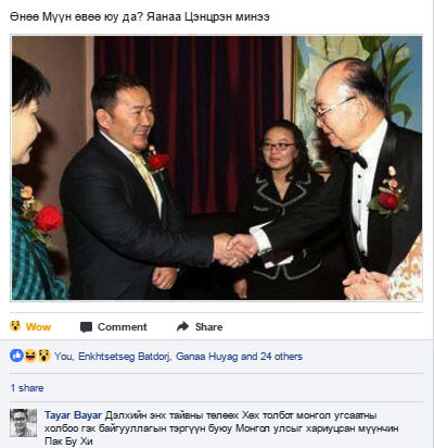 Харин Х.Баттулгын солонгос эртэй инээд алдан авахуулсан фото зургийн дор Тayar Bayar хэмээх хаягаас Энэ бол “Дэлхийн энх тайвны төлөөх Хөх толбот монгол угсаатны холбоо” гэх байгууллагын тэргүүн буюу Монгол Улсыг хариуцсан мүүнчин Пак Бу Хи мэдэгджээ.