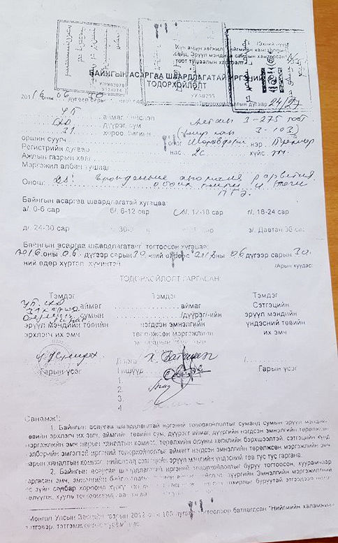 -Би анх СХД-ийн эмнэлэгт хяналтад орсон юм. Тэгсэн хяналтын маань эмч “Урнаа чи олон жилийн дараа хожуу төрж байгаа юм чинь сайн эмчтэй, сайн эхонд харуул. Чи ... эмнэлэгт /нэрийг хэлэхээс татгалзав/ гэдэг эмнэлэгт оч” гээд бичиг хийж өгөөд намайг тийшээ явуулсан. Би жирэмсэн байх хугацаандаа тэр эмнэлэгт л эход харуулж байсан. Тэнд 4-5 удаа эход харуулсан байх.