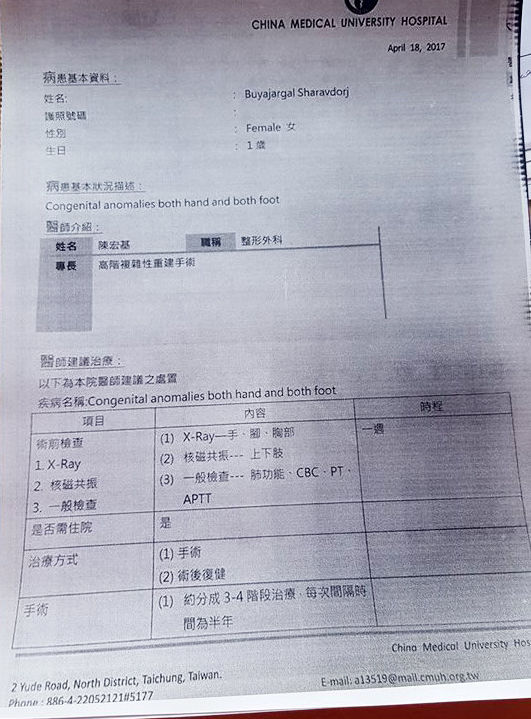 -Охин маань одоо ГССҮТ-ийн Гар сарвуу, бичил мэс заслын тасгийн их эмч н.Баатаржав хяналтад байдаг. н.Баатаржав эмчийн хэлснээр охины маань онош манайд анх удаа бүртгэгдээд байгаа нь энэ юм билээ. Манайд эмчлэх боломжгүй, гадаадад хагалгаанд орох шаардлагатай гэсэн. Таны хэлснээр нэг гартаа илүү эсвэл дутуу хуруутай, нэг хөлөндөө илүү эсвэл дутуу хуруутай. Гар, хөлөндөө илүү, дутуу хуруутай байх тохиолдол байдаг гэсэн.