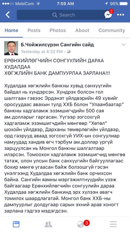 Сангийн сайд Б.Чойжилсүрэн гэсэн фэйсбүүк хаягнаас, Ерөнхийлөгчийн сонгуулийн дараа Худалдаа хөгжлийн банк дампуурна гэсэн мэдээлэл тараажээ. Энэ талаар Сангийн яамнаас албан ёсоор "худал фэйсбүүк хаягнаас худал мэдээлэл тарааж байна" гэж мэдээллээ. Тиймээс ард түмнийг худал ташаа мэдээлэлд автахгүй байхыг анхааруулав.