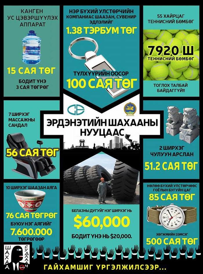 Харин “Эрдэнэт” үйлдвэрт хэн бараа нийлүүлж, ашигтай ажиллах уу гэдгийг хэдхэн дарга нар шийддэгээрээ ялгаатай. Цаашлаад, даргын шахааны бизнес чухал болохоос хямд зардлаар ашигтай ажиллах эсэх нь огт хамаагүй. Төрийн өмчит компаниудад бичигдээгүй хууль болтлоо хэрэгжсэн энэ тогтолцоо “Эрдэнэт” үйлдвэрт ч хэрэгжиж эхлэх нь тодорхой байгаа. Жишээлбэл, албаны хэрэгцээний бэлгэвч, 51.2 сая төгрөгийн чулуун арслан, 56 сая төгрөгийн массажны сандал, 60 ам.долларын белазны дугуй /бодит үнэ нь 20 ам.доллар/, нэр бүхий улстөрчийн нийлүүлсэн 100 сая төгрөгийн түлхүүрний оосор, 85 сая төгрөгийн үнэ бүхий гоёлын цаг, тоглоомын талбайгүй атлаа тоглохоор бэлтгэсэн теннисний бөмбөг зэрэг хэрэгцээгүй шахаануудаас бэлхнээ харж болно.