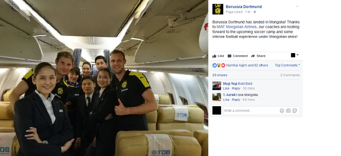 "Боруссиа Дортмунд Монголд газардлаа. МИАТ компанийн хамт олон талархсанаа илэрхийлж байна. Манай дасгалжуулагчид удахгүй эхлэх хөлбөмбөгийн хамтарсан бэлтгэл сургуулилалт болон Монголын тэнгэр доор хийгдэх зарим гайхалтай тоглолтуудыг тэсэн ядан хүлээж байна" хэмээн фэйсбүүк хуудаснаа нийтэлжээ.