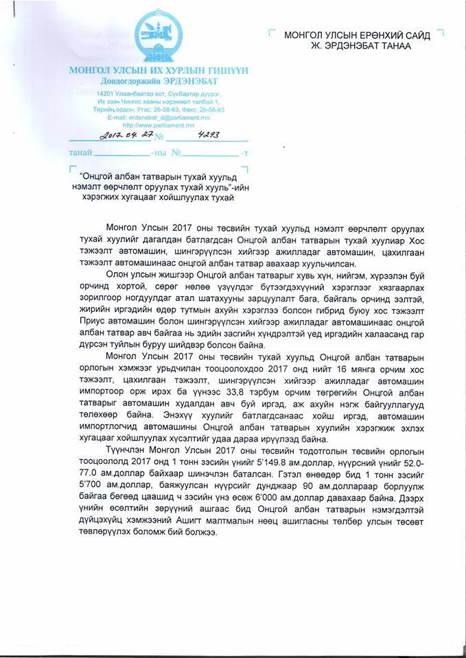 УИХ дахь АН-ын бүлгийн дарга Д.Эрдэнэбат өнгөрсөн дөрөвдүгээр сарын 27-нд Онцгой албан татварын хуулийн буюу приус машины татварыг үйлчлэх хугацааг хойшлуулах хүсэлтийг Ерөнхий сайд Ж.Эрдэнэбатад хүргүүлсэн билээ. Учир нь олон улсын жишгээр Онцгой албан татварыг хувь хүн, нийгэм хүрээлэн буй орчинд хортой, сөрөг нөлөө үзүүлэх бүтээгдэхүүний хэрэглээг хязгаарлах зорилгоор ноогдуулдаг. Гэтэл эрх баригчид шатахууны зарцуулалт бага, байгаль орчинд ээлтэй, жирийн иргэдийн өдөр тутмын хэрэглээ болсон хос тэжээлт приус автомашин болон шингэрүүлсэн хийгээр ажилладаг автомашинаас онцгой албан татвар авч байгаа нь эдийн засгийн хүндрэлтэй үед иргэдийн халаасанд гар дүрсэн туйлын буруу шийдвэр болсон байна хэмээн үзсэн юм. Тиймээс ч хуулийн дагаж мөрдөх хугацааг хойшлуулан 2017 оны аравдугаар сарын 01-ний өдөр болгон өөрчлөх хуулийн төсөл боловсруулан засгийн газрын хуралдаанаар хэлэлцэн шийдвэрлэж, улсын их хуралд яаралтай өргөн барьж батлуулахыг хүсэлтийг Ардчилсан намын бүлгээс гаргаад байсан юм. Тэгвэл Засгийн газрын өчигдрийн хуралдаанаар 2017 оны тавдугаар сарын 01-нээс мөрдөж эхэлсэн хуулийн үйлчлэлийг тодорхой хугацаанд хойшлуулахыг дэмжсэн байна. Хэрвээ энэхүү өөрчлөлтийг УИХ баталбал өмнө нь татвар төлдөггүй байсан дээрх төрлийн автомашинуудад хуулийн дагуу 375.000-6.675.000 төгрөгийн татвар ногдохоор болж жирийн иргэд приус машинаа даруй 5-8 сая төгрөгөөр нэмэгдсэн үнээр авч унахгүй болох нь.
