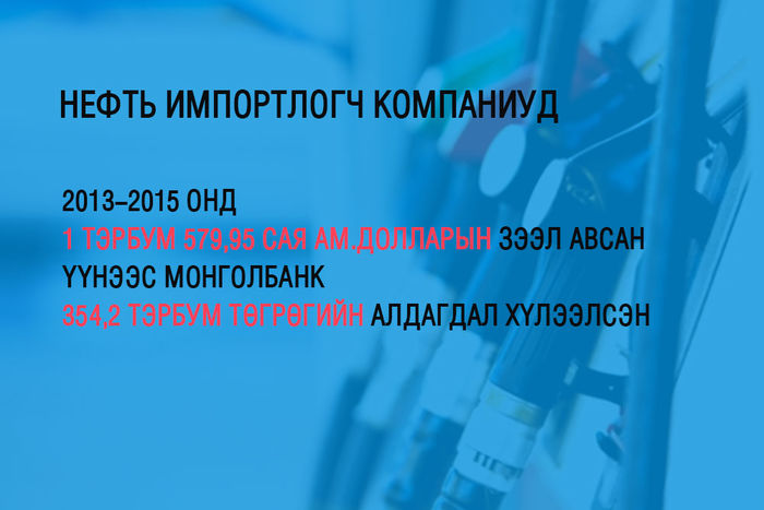 Түүнчлэн нефть импортлогч компаниудад 2013-2015 оны хугацаанд нийт нэг тэрбум 579.95 сая ам.долларыг зах зээлийн ханшаас 300 хүртэлх төгрөгөөр хямд худалдсан. Үүнээс Монголбанк 354.2 тэрбум төгрөгийн ханшийн зөрүүний бодит алдагдал хүлээжээ. Энд нэг зүйл анхаарал татаж байна. Төвбанк 226.4 тэрбум төгрөгийг жилийн 0.89 хувийн хүүтэй зээлийг арилжааны банкуудад олгож, жинхэнэ дураараа дургиж, дунд чөмгөөрөө жиргэнэ гэгч болжээ. Арилжааны банкууд 0.89 хувийн хүүтэй авсан зээлээ 2.91 хувийн хүү нэмж, шатахуун импортлогч компаниудад олгосон байна. Энд дурдсан бүх баримт бол Монголбанкны 2012-2016 оны үйл ажиллагаанд хийсэн УИХ-ын шалгалтын ажлын хэсгийн гаргаж ирсэн баримтууд гэдгийг тодотгоё.