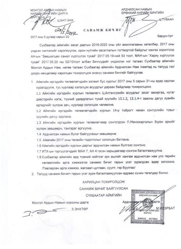 Сүхбаатар аймгийн Иргэдийн төлөөлөгчдийн хурал 33 суудалтайгаас нэг суудал нь маргаантай, шийдэл хүлээсээр багагүй хугацааг үдсэн билээ. Тиймээс энэхүү асуудлыг шийдэж, өнгөрөгч тавдугаар сарын 20-ны өдөр МАН-ын Нарийн бичгийн дарга Ц.Бат-Энх, АН-ын Ерөнхий нарийн бичгийн дарга Ц.Туваан, Сүхбаатар аймгийн МАН-ын хорооны дарга З.Энхтөр, Сүхбаатар аймгийн АН-ын хорооны дарга М.Идэрбат нар хамтарсан зөвшилцөлд хүрч санамж бичиг байгуулсан юм.