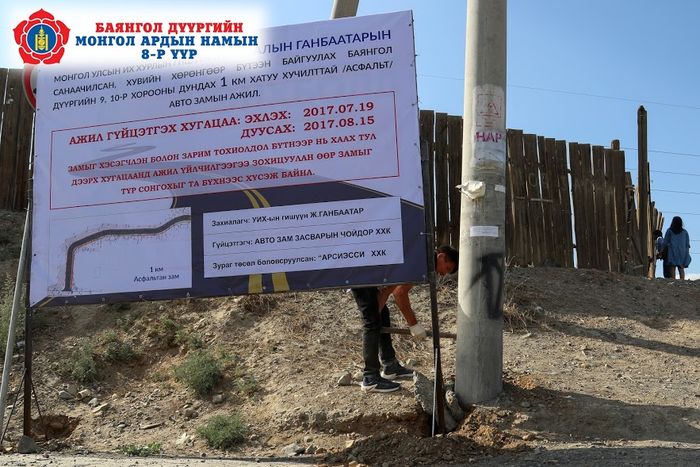 Миний сонгогдсон тойргийн 9, 10 дугаар хороонд шороон замын асуудал олон жил яригдаж ирсэн. Тиймээс тойргийн иргэдийн өмнө тулгамдсан асуудлыг шийдвэрлэхийн тулд өөрийн хөрөнгөөр явган хүний замтай, гэрэлтүүлэгтэй иж бүрэн автозам барих ажлыг эхлүүлээд байна. Уг нь нийслэлийн эсвэл дүүргийн хөрөнгөөр барих ёстой зам юм. Гэхдээ нийслэлийн төсөв тийм ч хүрэлцээтэй биш байгаа. Тиймээс нийслэлийн хөрөнгийг хүлээхгүйгээр сонгогчдодоо амласан амлалтаа биеүүлэхийн тулд хувийн санаачилгаар ажлаа эхлүүлсэн. Ингэснээр тус хороонд тулгамдаад байсан томоохон асуудал шийдэгдэж, иргэд эрүүл аюулгүй орчинд амьдрах боломж бүрдэнэ.