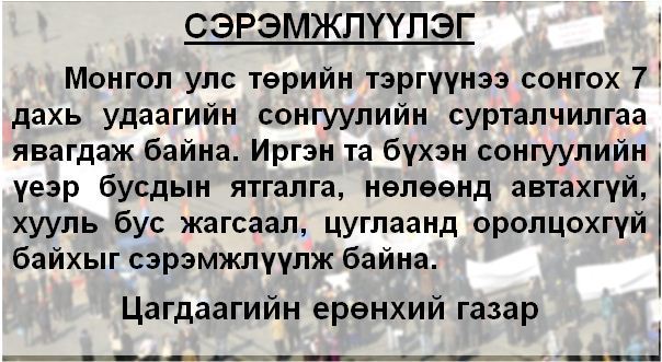 Монгол Улс төрийн тэргүүнээ сонгох долоо дахь удаагийн сонгуулийн сурталчилгаа явагдаж байна. Иргэн та бүхэн сонгуулийн үеэр бусдын ятгалга, нөлөөнд автахгүй, хууль бус жагсаал цуглаанд оролцохгүй байхыг сэрэмжлүүлж байна.