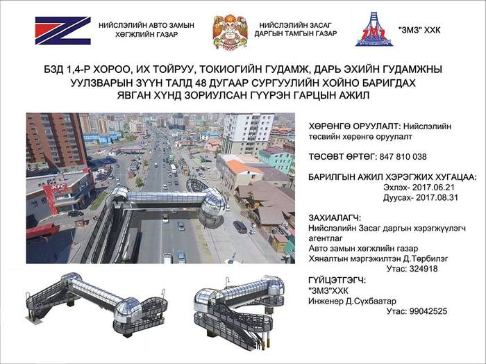 Дарь эхийн гудамжны уулзварын зүүн талд 48-р сургуулийн хойно “Явган хүний гүүрэн гарц” барих ажил эхэллээ. Металл хийц бүхий “Явган хүний гүүрэн гарц”-ын урт нь 34м, өргөн нь 3м, цахилгаан болон явган шаттай байх аж.