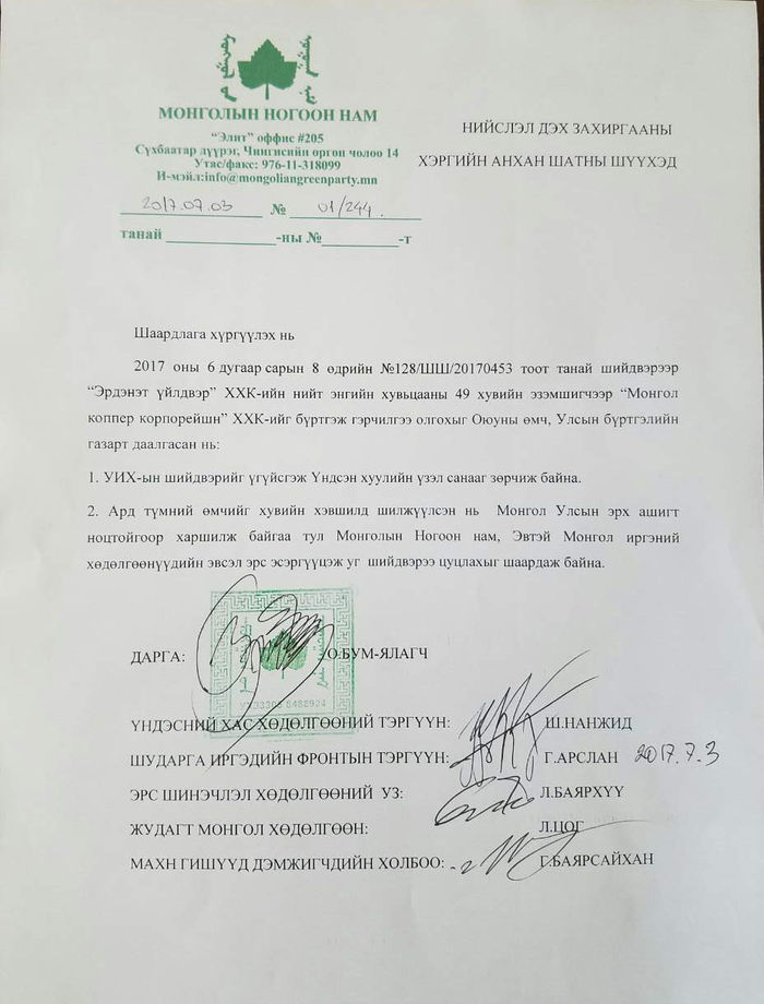 Монголын Ногоон нам, Үндэсний Хас хөдөлгөөн, Шударга иргэдийн фронт, Эрс шинэчлэлийн хөдөлгөөн, Жудагт Монгол хөдөлгөөн, МАХН гишүүд дэмжигчдийн холбоо хамтран Нийслэл дэх захиргааны хэргийн анхан шатны шүүхэд шаардлага хүргүүллээ. Эл шаардлагад “2017 оны 6 дугаар сарын 8-ны өдрийн № 128/ШШ/20170453 тоот танай шийдвэрээр “Эрдэнэт үйлдвэр” ХК-ийн нийт энгийн хувьцааны 49 хувийн эзэмшигчээр “Монгол коппер корпорейшн” ХХК-ийг бүртгэж гэрчилгээ олгохыг Оюуны өмч, Улсын бүртгэлийн газарт даалгасан нь:
