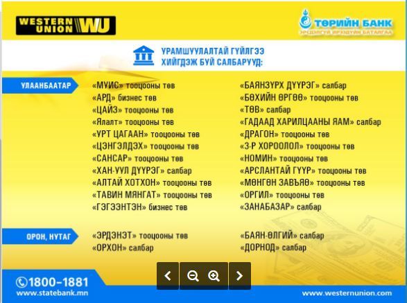 Төрийн банк 2017 оны 10 сарын 01-нийг хүртэл WESTERN UNION гадаад мөнгөн гуйвуулгын үйлчилгээндээ урамшууллын аян зарлаж байна. Тус банкны дараахь 26 салбар нэгжээр WESTERN UNION гадаад мөнгөн гуйвуулгын гүйлгээ хийсэн харилцагч бүр гарын бэлэг гардан авах юм.