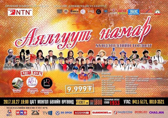 “Аялгуут намар” хүндэтгэлийн тоглолт энэ сарын 27-нд Монгол бөхийн өргөөнд болно. Монголын урлагийн ертөнцийн сор болсон уран бүтээлчид намар цагийн сүүлийн тоглолтоор тайзнаа чуулан, нэгэн үдшийг өнгөрөөх гэж байна