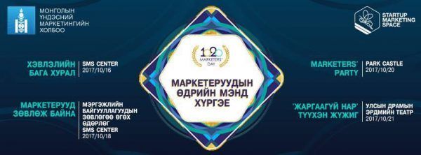 Маркетеруудын өдрийн хүрээнд энэ сарын 16-21-ны хооронд “I’m a marketer” уриан дор маркетингийн салбарын мэргэжлийн холбоо, агентлаг, зөвлөх, их дээд сургууль, төрийн болон бизнесийн байгууллага идэвх санаачлага гарган маркетингийн салбарыг сурталчлах, хийсэн бүтээснээ бусдад таниулах төрөл бүрийн арга хэмжээг зохион байгуулж байна.