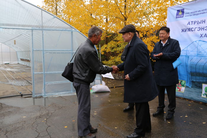 "Атрын III аян"-ыг үргэлжлүүлэх, "Жимс, жимсгэнэ" үндэсний хөтөлбөрийн хүрээнд хүнсний ногоо, жимс жимсгэний нэр төрөл, үйлдвэрлэлийг нэмэгдүүлэх зорилгоор БНСУ, БНХАУ-д үйлдвэрлэсэн нийлэг хальсан хүлэмжийг хүнсний ногоо, жимс, жимсгэний үйл ажиллагаа эрхэлдэг иргэн, аж нэгжид 30 хувийн урьдчилгаатай, 4 жилийн хугацаатай хүүгүй зээлээр олгож эхэллээ. Тодруулбал, улсын төсвийн 1.83 тэрбум төгрөгийн санхүүжилтээр 120 м2 талбайтай 520 иж бүрдэл, 32 м2 талбайтай 200 иж бүрдэл, нийт 720 иж бүрдэлийг хүлээн авах үйл ажиллагаа өнөөдөр боллоо. Үйл ажиллагаанд ХХААХҮ-ийн сайдын үүрэг гүйцэтгэгч П.Сэргэлэн, ХХААХҮЯ-ны Төрийн Захиргааны удирдлагын газрын дарга М.Мөнхбаясгалан болон бусад албаны төлөөлөл оролцлоо.