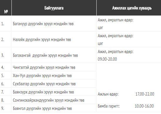 Энэ хүрээнд дүүргийн эрүүл мэндийн төвүүд ажлын болон амралтын өдрүүдэд доорх цагийн хуваарийн дагуу ажиллаж эхэлсэн бөгөөд томуу, томуу төст өвчний талаархи зөвлөгөө мэдээлэл болон эмнэлгийн тусламж, үйлчилгээг түргэн шуурхай, хүртээмжтэй байдлаар үзүүлэхээр зорьж байна гэж нийслэлийн Эрүүл мэндийн газраас мэдээллээ.