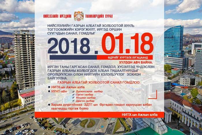 Нийслэлийн иргэд оршин суугчид та бүхэн газрын албатай холбоотой санал гомдлоо 01 сарын 08 хүртэл доорх газруудад гаргаж болно.
