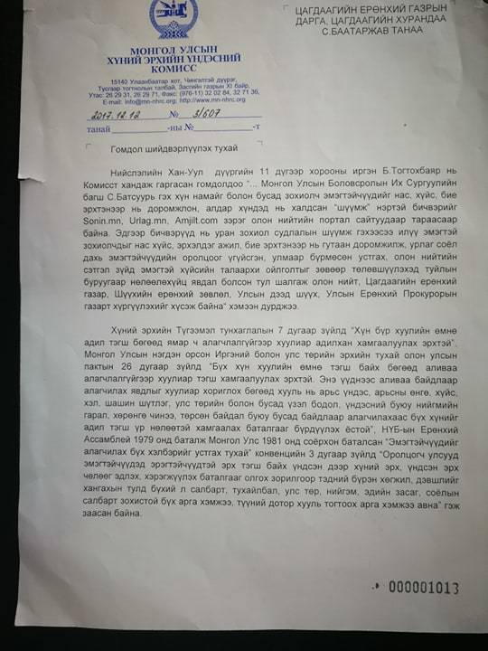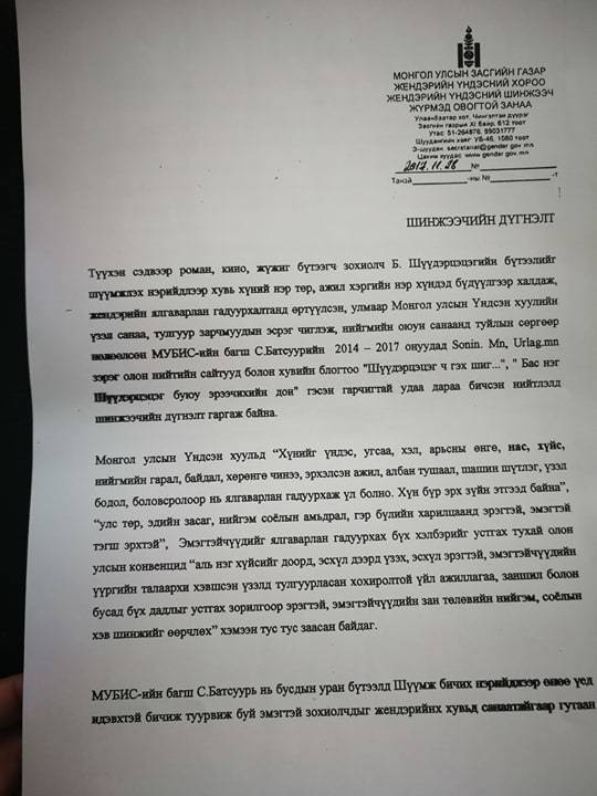 Зохиолч Б.Шүүдэрцэцэгийн өмгөөлөгч нас, хүйсээр ялгаварлан гадуурхсан гэж үзэн Г.Батсуурийн эсрэг нэхэмжлэл гаргаад байсан юм. Г.Батсуурь удаа дараа эмэгтэй зохиолчдыг нас, хүйсээр нь ялгаварлан гадуурхсаныг нотолсон Жендерийн үндэсний шинжээчийн дүгнэлт гарсан нь уучлалт хүсэх үндэслэл болсоныг өөрөө ч залруулгадаа илэрхийлжээ. Үндсэн хууль, Эмэгтэйчүүдийг ялгаварлан гадуурхах бүх хэлбэрийг устгах олон улсын конвенц, Жендерийн эрх тэгш байдлыг хангах тухай хуулиудыг зөрчсөн гэж шинжээч дүгнэсэн байна. Жендерийн Үндэсний хорооны шинжээч Ж.Занаа дүгнэлтэндээ “ …МУБИС-ийн багш Г.Батсуурь нь шүүмж бичих нэрийдлээр өнөө үед идэвхтэй бичиж эмэгтэйчүүдийг жендерийнх нь хувьд санаатайгаар гутаан доромжилсон үг хэллэг хэрэглэсэн…, хүнийг гадаад төрхөөр нь дорд үзсэн.., хов жив нь зөвхөн эмэгтэйчүүдийн шинж төрх мэтээр өрөөсгөл дүгнэж.., эмээ нар хэмээн насаар нь гадуурхсан, үзэн ядсан, ялгаварлан гадуурхсан нийтлэл бичсэн” гэж өгүүлжээ. Энэхүү мэдээллээр Хүний эрхийн үндэсний комисс ч хууль хяналтын байгууллагад хандан байр сууриа илэрхийлсэн юм байна.