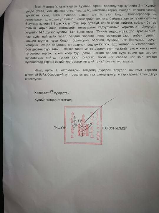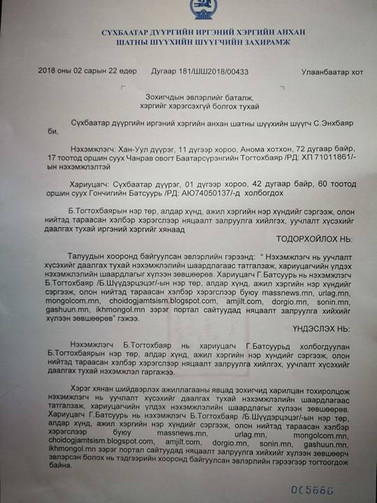 Утга зохиолч шүүмжлэгч Г.Батсуурь зохиолч Б.Шүүдэрцэцэгээс 2 дугаар сарын 23-ны өдөр уучлалт хүсч, sonin.mn зэрэг сайтад нийтэлсэн байна. Тэрбээр Б.Шүүдэрцэцэгийн нэр төр, алдар хүнд, ажил хэргийн нэр төрийг сэргээн, залруулга гаргахаа хүлээн зөвшөөрчээ. Г.Батсуурь, Б.Тогтохбаяр \Б.Шүүдэрцэцэг\ нарын эвлэрлийг баталж, Сүхбаатар дүүргийн шүүгч С.Энхбаярын захирамж гаргасан юм байна. Г.Батсуурь уучлал хүссэнээр, Б.Шүүдэрцэцэгийн итгэмжлэгдсэн төлөөлөгч нэхэмжлэлээсээ татгалзаж, энэхүү иргэний хэрэг хаагджээ.