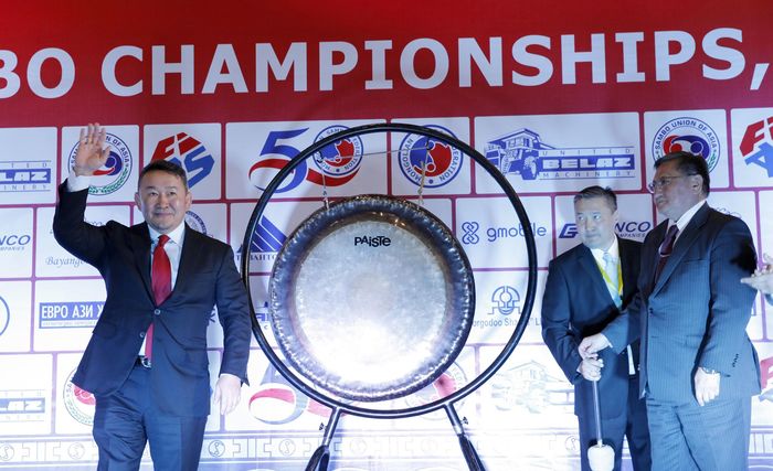 Монгол Улсын Ерөнхийлөгч Х.Баттулга үг хэлснийхээ дараа Самбо бөхийн Ази тивийн аварга шалгаруулах 25 дахь удаагийн тэмцээний ёслолын ажиллагаа албан ёсоор нээж байгааг мэдэгдэж харанга цохив.