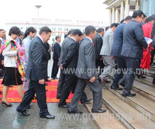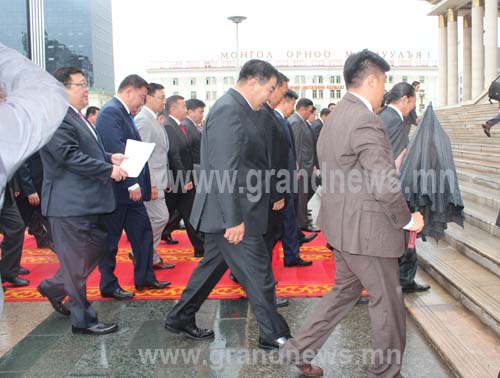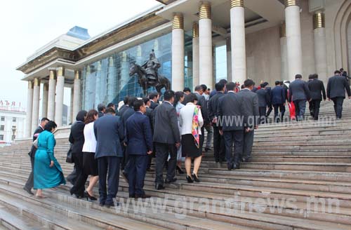 Харин өнөөдөр УИХ-д сонгогдсон 69 гишүүн тангарагаа өргөж, төрийн туганд хүндэтгэл үзүүлсэн юм. Мөн шинээр сонгогдсон гишүүдийн бүрэн эрхийг хүлээн зөвшөөрөх асуудлаар санал хураалт явуулж, 100 хувийн саналаар дэмжиж, 6 дахь парламентад анх удаа алхны дуу сонсогдлоо. Хуралдааны дараа шинэ “ангийнхан” анхны зургаа татуулж, Сүхбаатарын талбайд байрлах Чингисийн хөшөөнд хүндэтгэл үзүүлснийхээ дараа Төрийн ордны урд хаалгаар эргэн орсон юм.