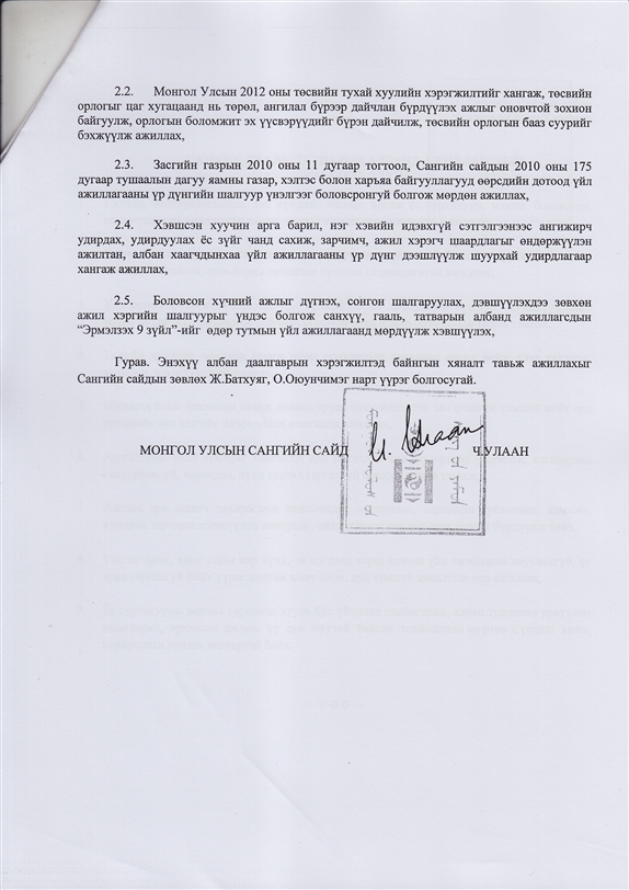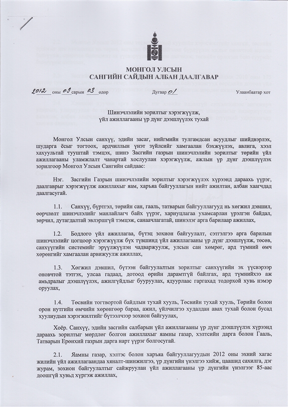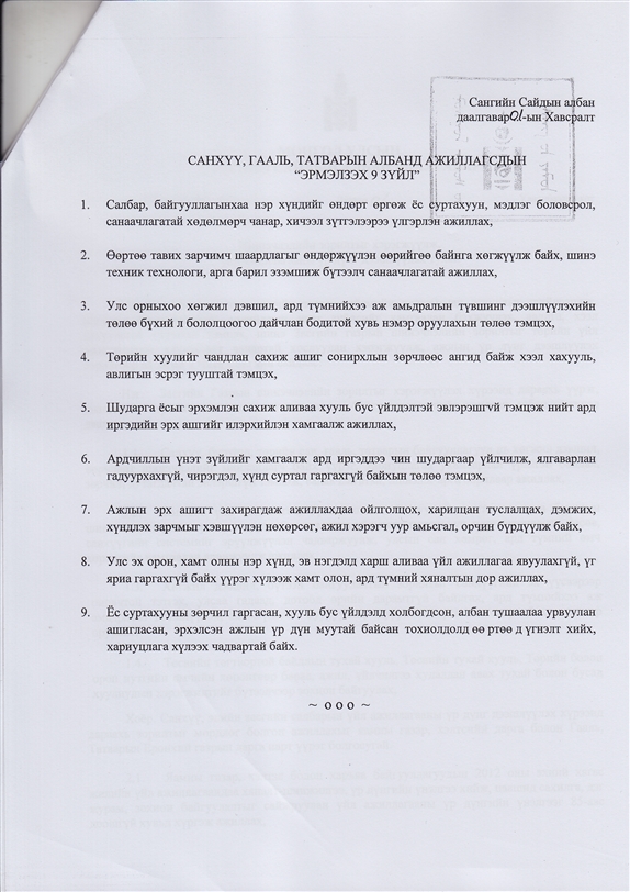 Шинэчлэлийн зорилтыг хэрэгжүүлж, үйл ажиллагааны үр дүнг дээшлүүлэх тухай албан даалгаврыг Монгол улсын Сангийн сайд Гаалийн ерөнхий газарт өчигдөр хүргүүлээд байгаа билээ. Албан даалгаврыг Гаалийн ерөнхий газрын харьяа газар, хороод үйл ажиллагаандаа мөрдлөг болгон ажиллах учиртай гэнэ.