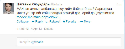 Цагдаа нараа үл огоорон дайрч жагсаал цуглаан хийсэн, чуулганы танхимаас Ерөнхийлөгчийнхөө үгийг таслан байж гарч одсон, махны үнээ “мангар” хямдаар тооцож суугаа Ардын намын даргын “насны” онигоо гээд өнөөдөр улс төрийн ууган намынханы өдөр байлаа. Харин мэргэн цэцэн үгээрээ хэнийг ч ангайлгаж, цээж юугаа дэлдэн мэдэмхийрч байдаг Ерөнхийлөгч тэргүүтэй АН-ынхан амаа үдүүлсэн аятай таг дуугүй өдрийн хагасыг өнгөрөөсөн. Тэгвэл АН-ынханы ам ангайх ганц боломж нь махны үнэ 1200 хүрсэн магнай тэнийлгэм үйл явдал байлаа. Энэ боломжийг яаж алдхав АН-ын ерөнхий нарийн бичгийн дарга Ц.Оюундарь хатагтай харин ч нэг сайхан жиргэж басхүү дарга нарынхаа “дажгүй” ярьдаг нууцаас дэлгэлээ. Тэрээр “МАН-ын ажлын албаныхан юу хийж байдаг бнаа? Даргынхаа хэлэх үг нтр-ийг сайн бэлдэж өгөхгүй дээ. Арай дэндүүлчихжээ” хэмээжээ. Тэгэхээр уран цэцэн үг урсгаж байдаг АН-ын дарга нарын арын албаныхан аймар сайн ажилладаг бололтой.