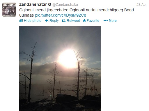 Улс төрийн салбарт ухрах эрхгүй зүтгэж буй эрхмүүд түмэн олноо төлөөлөн хийморь юугаа сэргээх нэрийдлээр дархан цаазад уулын оргилыг зорих болсон. Саяхан Ерөнхий сайд маань “Бурхан Халдун”-д буян заяагаа даатгаж яваад буцахдаа төөрч бөөн юм болсоныг олон хүн мэднэ. Тэгвэл энэ удаа МАН-ын генсек Г.Занданшатар ойрхон ч гэсэн Богд уулынхаа оройд гаран энэ өглөөг угтжээ. Тэрээр твиттер хуудаснаа "өглөөний мэнд жиргээчдээ, өглөөний нартай мэндчилгээг Богд уулнаас" хэмээжээ. Ямартаа ч урд шөнө цас орж тэнгэр бүүдийсэн болохоор тэр үү, түүнийг “Алтанхуяг”-даж төөрч будилах вий хэмээсэн хүмүүс их байгааг энд дуулгая.