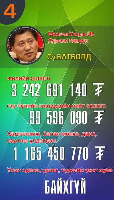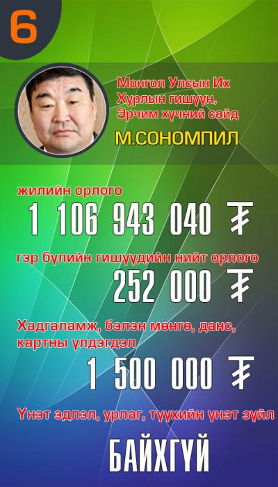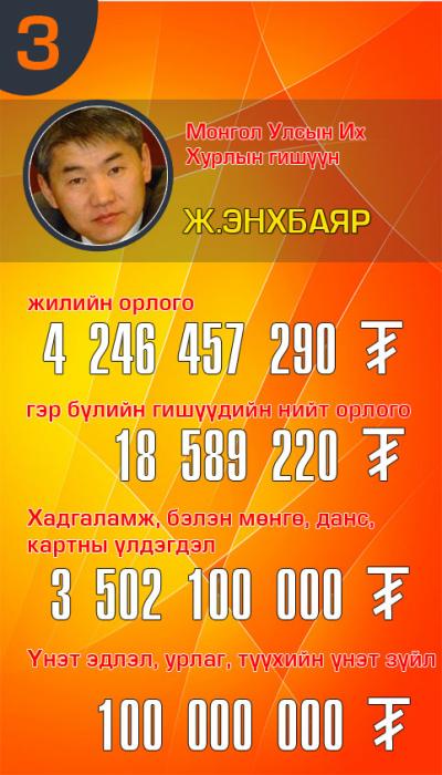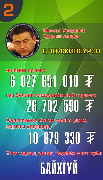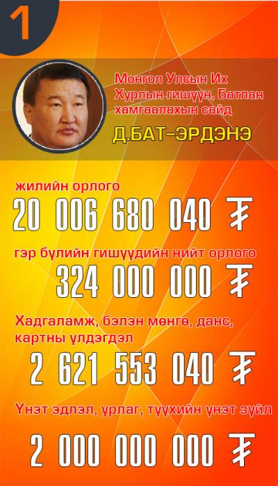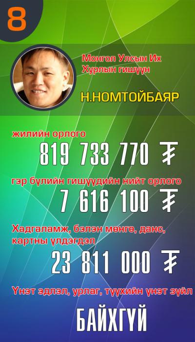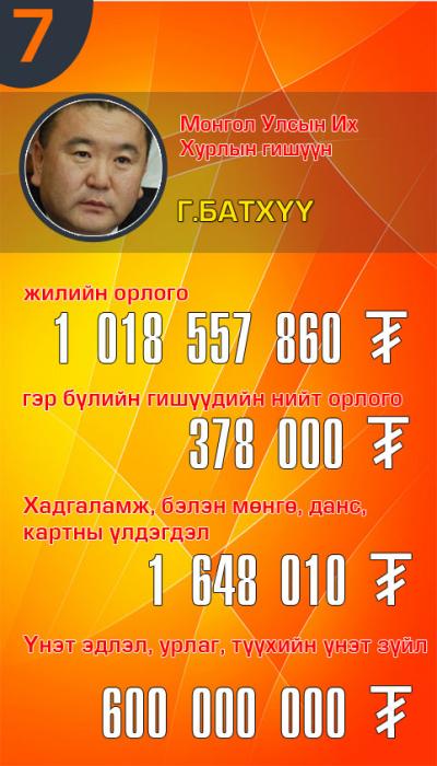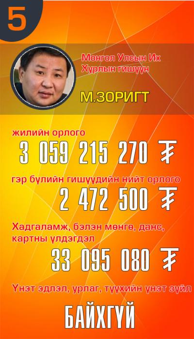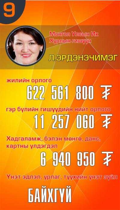 Улсын их хурлын гишүүдийн хөрөнгө орлогын мэдүүлгээс харахад эдгээр гишүүд жилд хамгийн их орлоготой гишүүнээр тодорч байна. Тэдний жилийн орлогыг нийлүүлбэл 40.756.552.060 төгрөг болж байгаа юм.