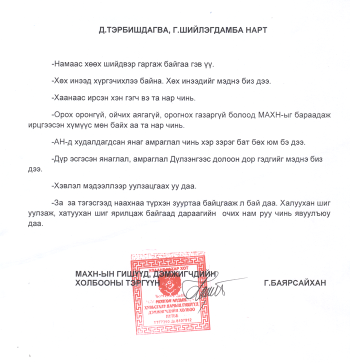 МАХН-ын Бага чуулганы IX хуралдааны талаар МАХН-ын гишүүд дэмжигчдийн холбооны тэргүүн Г.Баярсайхан “хурал” биш “гурил” болсон гэж ихээхэн шүүмжлэлтэй хандаж, хэд хэдэн хэвлэл мэдээллийн хэрэгсэлээр хэл амаа хурцлаад амжсан. Тэгвэл Г.Баярсайхан хэмээх үл таних эрхэм үнэн тасархай хошигнол маягын юм бичиж өнөөх муу Д.Тэрбишдагва, Г.Шийлэгдамба нарт хаяглажээ. Ингээд түүний элдэв хошигнолыг танд хүргэж байна.