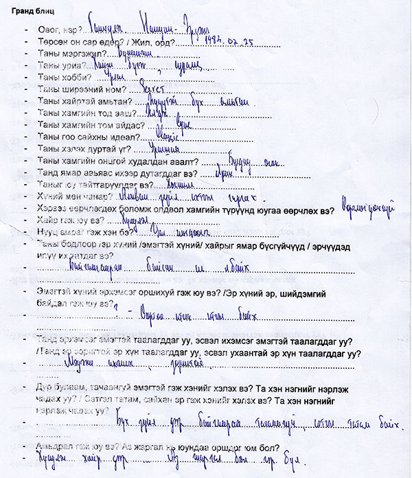 Бид “Гранд блиц” булангаараа олны танил хүмүүсийн өөрийгөө илэрхийлэх товч асуултад хариулт авдаг. Энэхүү блиц асуултад тухайн хүн өөрийнхөө гараар хариулт өгч, гарын үсгээ зурдгаараа онцлогтой юм.