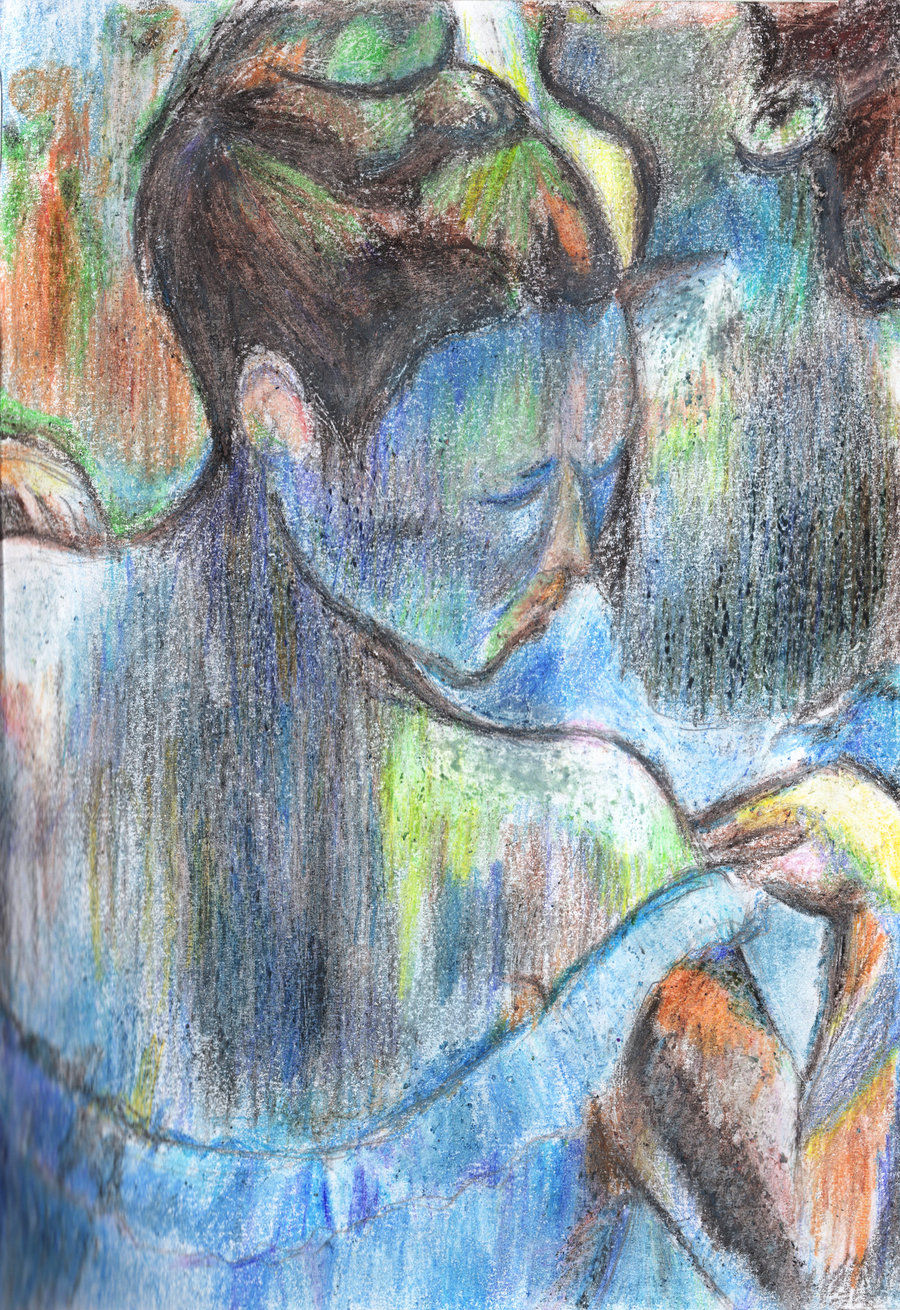 Цэнхэр өнгө өөрөө гунигийн өнгө. Ягаан өнгө романтик, гэнэхэн өнгө. Дега чухам энэ 2 өнгийг балетын бүжигчдийнхээ арын фонд ашигладаг байв. Хамгийн харгис, хүнд хэцүү гэгддэг балетын урлагт чухамхүү урлагт дурласан гэнэн, романтик сэтгэлт залуу охид, залуус дурлаж дурласан хойноо гуниг, зовлон дүүрэн гялалзсан боловч богинохон он жилүүдийг туулдаг жамыг харуулах гэж зорьсон биз. Чухам энэ мэдрэмжээрээ тэр суут импрессионист зураач гэгддэг байх.