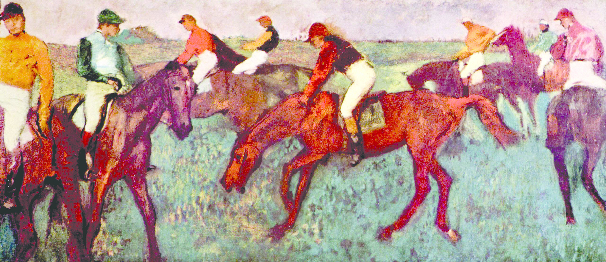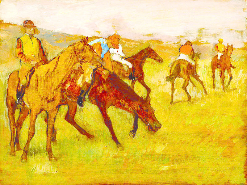 /Нормандиаар аялах нэгэн аялалынхаа үеэр тэрээр морины үйлдвэрт зочлон угсааны морьдыг хараад гайхан биширчээ. Үүнээс хойш нэг хэсэг уралдааны морьдоор “занималдсан” бөгөөд “Уралдааны морьд гарааны өмнө”, “Уралдаан” гэх мэт хэд хэд бий./