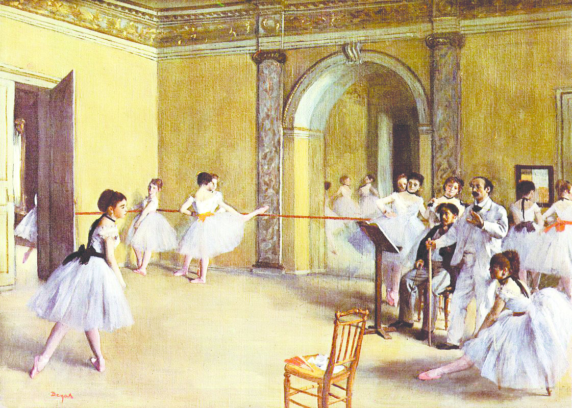 Жишээ нь “Бүжгийн анги” зурагт балетын бүжигчдийг тайзан дээр тоглолтын үед биш хөшигний ард бэлтгэл сургуулилтын үед нь дүрсэлсэн байдаг. Бүжигчдийн царайд бодол анхаарлаа төвлөрүүлсэн, ядарч зүдэрсэн байдал тодорчээ. Өнөөх “хиймэл” инээмсглэл, уламжлалт үзэсгэлэнт төгс байдал нь оргүй алга болсон байх юм. Туранхай хэрзгэр нуруу, чөргөр тохой, ясан хүзүү гээд бүжигчин бүсгүйчүүдийн хөдөлгөөн нь болхи, эргэлт нь эв хавгүй ажээ.