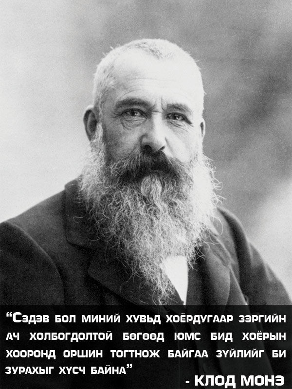 1840 оны 11-р сарын 14-нд төрж, 1926 оны 12-р сарын 5-нд таалал төгссөн Клод Монэ байгаль гэхээс илүү ухамсраа илэрхийлдэг философийн хөдөлгөөний хамгийн тууштай, хамгийн бүтээлч төлөөлөгч байв. Ялангуяа дүрслэх урлагийн plain air буюу байгалийн байдлыг задгай агаарт нь зурдаг төрөлд ихээхэн амжилт гаргасан юм. Уран зургаар сэтгэгдлийг гайхамшигтайгаар дүрслэн үзүүлдэг Монэ улс төр, шашин, шүтлэгийн аль алинаас нь ангид эрх чөлөөт уран бүтээлч байсныхаа хувьд тухайн үеийн нэр хүндтэй шагнал болох “Хүндэт легионы загалмайт одон”-гоос татгалзаж байсан суут бодгаль.