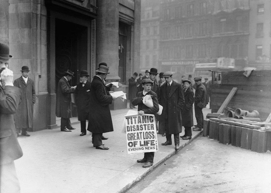 Алдарт Титаник хөлгийн сүйрлийн мэдээг нийтэлсэн сонинг зарж буй сонингийн худалдаачин хүү, 1912 оны дөрөвдүгээр сарын 16