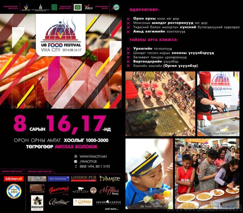 Нийслэлийн 375 жилийн ой, “Найрсаг Улаанбаатар” хөтөлбөрийн хүрээнд Нийслэлийн Соёл урлагийн газраас Вива сити хороололд “UB food Festival-2014" хоолны фестивалийг энэ сарын 16,17-ны өдрүүдэд хоёр дахь жилдээ зохион байгуулах гэж байна.
