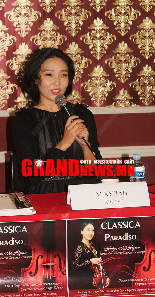 Санкт- Петербург хотын хөгжмийн сургуулийг төгсөж ирсэн хийлч М.Хулан “Classica Paradiso” буюу “Мөрөөдлийн Сонгодог” нэртэй анхны бие даасан тоглолтоо хийхээр болжээ. Энэ сарын 25-нд Дуурь Бүжгийн ЭрдмийнТеатрт болох тоглолтын хөгжмийн найруулагч, удирдаачаар төгөлдөр хуурч Б.Анар ажиллаж байгаа юм.